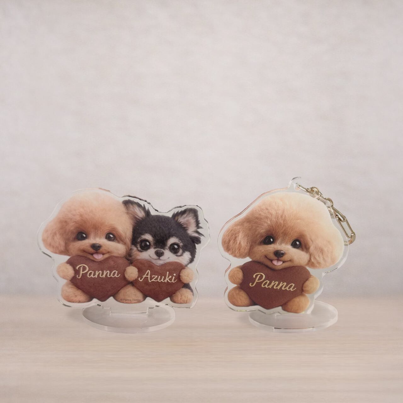 パンナとあずきが仲良くハートを抱える、Panna Family公式アクリルスタンド。